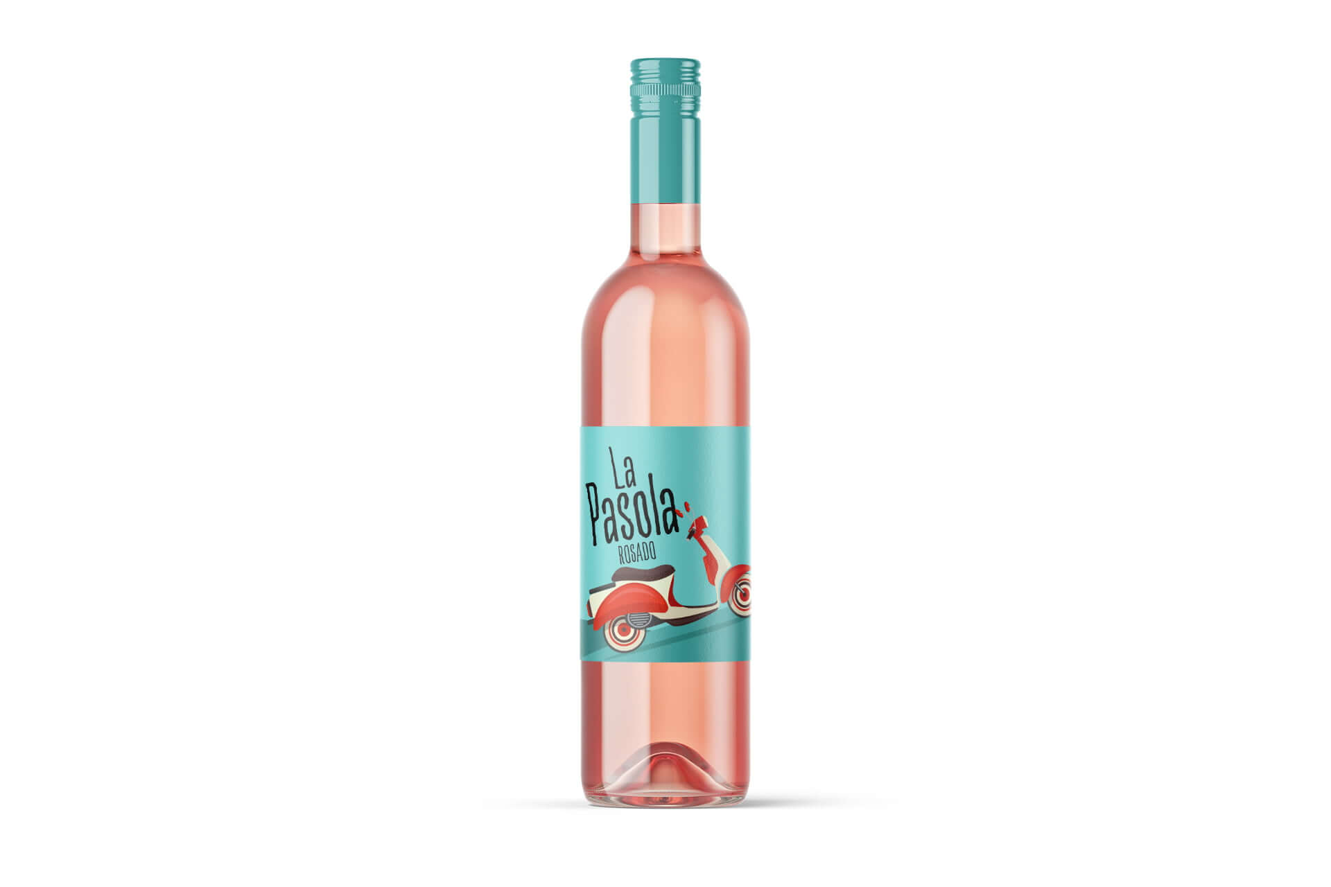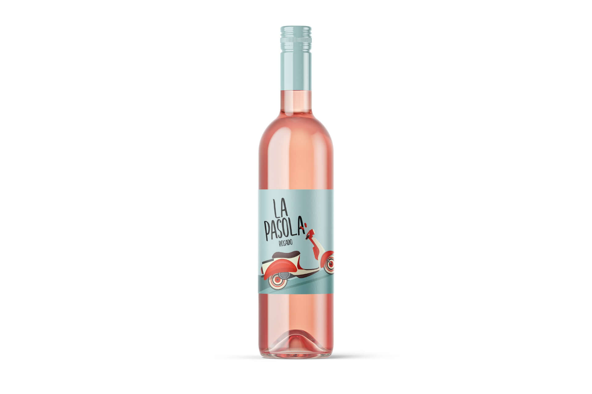 „La Pasola“ Rosé-Etikett von Jacques' Wein-Depot - ein sommerliches, lebhaftes Design mit Vintage-Roller-Motiv und abstrakten grünen Hügeln, handschriftlicher Typografie für unverwechselbare Identität und spanischen Charakter.